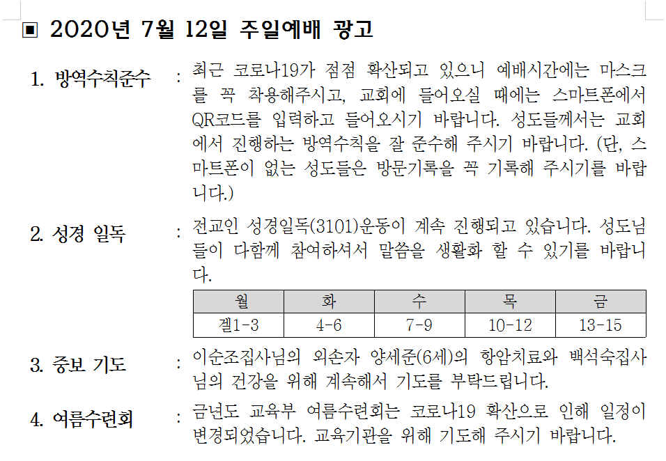 2020년 7월 12일 교회소식